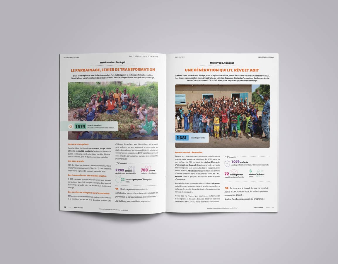 Mise en page du rapport annuel "Bâtir Ensemble", qui revient sur une année d’actions menées sur le terrain, au cœur des programmes de parrainage et des projets solidaires de l'ONG World Vision France. 👉🏻 Pour découvrir le rapport complet : https://www.visiondumondefrance.fr/BE/WV-BE2025.pdf